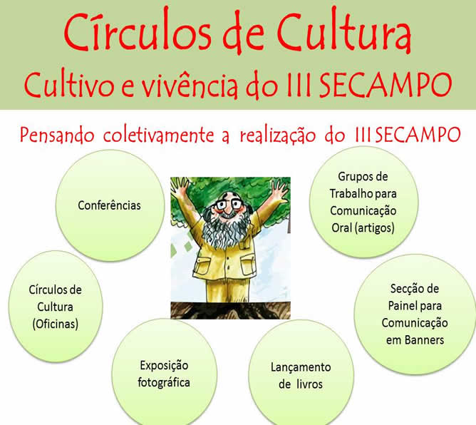 Os Círculos de Cultura constituem-se como espaços pedagógicos e organizativos visando a realização do III SECAMPO que encontra-se com uma programação articulada. Conferencistas, Coordenadores de GT, Painel, Círculos de Cultura, (...) já confirmaram sua presença no III SECAMPO o que pode ser conferido no site do SECAMPO.