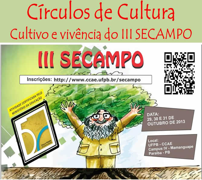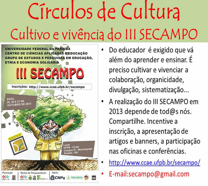 A Coordenação do GEPeeeS convida a todos para participar e compartilhar de todas as atividades desse processo educativo. O III SECAMPO deve acolher inúmeros estudantes, professor e pesquisadores universitários, professores e gestores da rede pública e militantes dos movimentos sociais. Participar e Compartilhar via Redes Sociais se faz necessário e vital para que o III SECAMPO seja representativo e possa vir a ampliar o capital cultural de todos nesse ano de 2013 que comemora-se toda a trajetória de Paulo Freire.