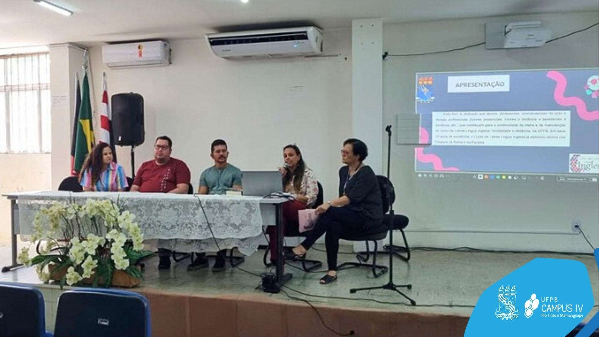 Compuseram a mesa de abertura do I SIELLC a professora Sandra Maria Araújo Dias, Coordenadora Geral do Evento, o professor Joseilme Fernandes Gouveia, Diretor do Centro de Ciências Aplicadas e Educação (CCAE), a professora Jessica Holanda de Medeiros Batista, diretora do Centro Municipal de Língua Estrangeira (CELEST- SEDEC/PMJP), a professora Michelle Bianca Santos Dantas, Chefa do Departamento de Letras (DL) e representante dos professores formadores do Curso de Letras Língua Inglesa (EaD), a professora Clevia Suyene Cunha de Carvalho, Chefe da Diretoria de Ensino, Gestão e Escola de Formação (DEGEF-SEDEC/PMJP), a professora Cristiane Sousa De Assis, Chefe de Divisão de Formação de Programas de Educação Superior – SEDEC /PMJP – Coordenadora do Polo UAB João Pessoa e representante das Coordenações de Polo UAB e a discente Rayane Rocha Rodrigues dos Santos, representante dos alunos do Curso de Letras Língua Inglesa (EaD)UFPB.