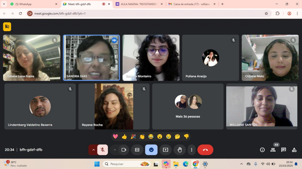 A coordenação do curso de Letras Inglês EAD promoveu a Aula Magna 2025.1, no dia 25/03/2025 às 19h30 pelo Google Meet. A aula contou com participação de alunos do tutores e professores do curso, além da chefia do Departamento de Letras e Direção de Centro.