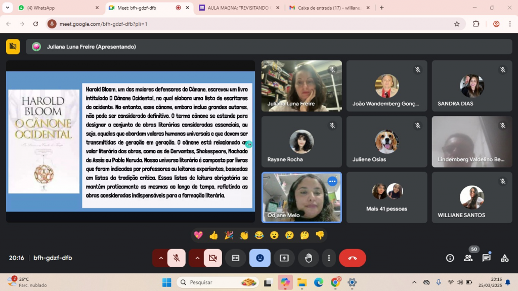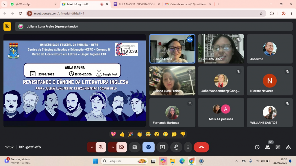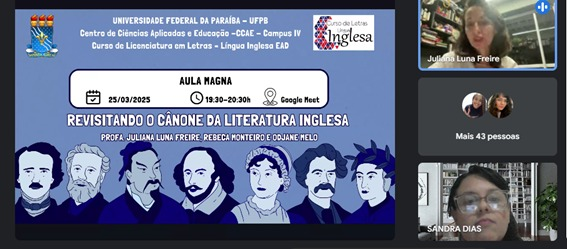 A aula magna, intitulada “Revisitando o Cânone da Literatura Inglesa”, foi coordenada pela Profa. Dra. Juliana Luna Freire, em parceria com Rebeca Monteiro e Odjane Melo.
