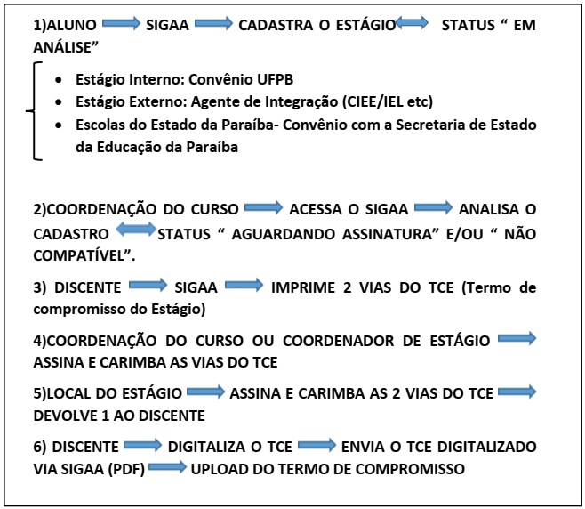 Tendo em vista o esforço e orientação da Direção de Centro, foi criado o Convênio Centro de Ciências Agrárias/UFPB/MEC, sendo assim os discentes devem fazer o cadastro de Estágio Obrigatório no convênio CCA e os Estágios Não Obrigatórios devem ser cadastrados no convênio UFPB, assim também renovação do Bolsa estágio e contração: convênio da UFPB: