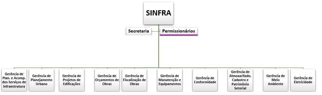 A SINFRA é composta por 90 servidores e 10 estagiários distribuídos da seguinte forma: